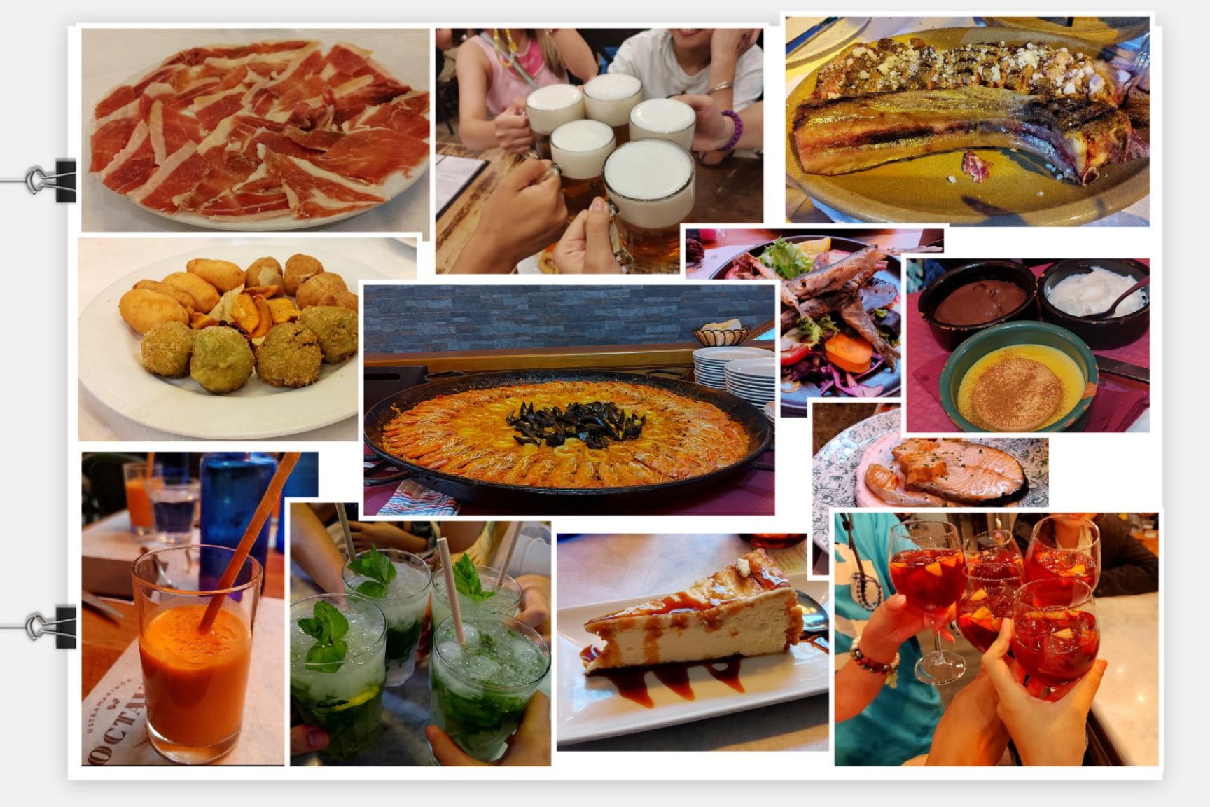 西班牙的饮食文化也常常被人赞叹。最有名的就是西班牙火腿、海鲜饭,以及一些著名小吃:洋葱圈、“烤包子”、Tapas、Taco、炸鱿鱼、烤乳猪,等等;饮品和甜点方面,西班牙纯正的冰啤酒、桑格利亚、Sex on the Beach,以及经典的Mojito,都为这次旅途增添了不一样的色彩,每一次欢呼,每一次举杯畅饮,都宣告着我们值得祝贺的一天。